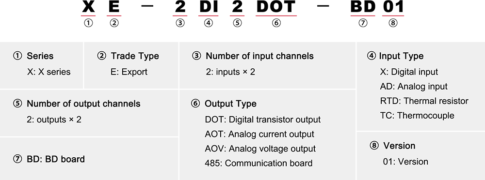 | 2 | XE-4AI-BDO1 | 4AI, 15-Bit-Stromtyp | analoge Stromeingänge ×4 |
