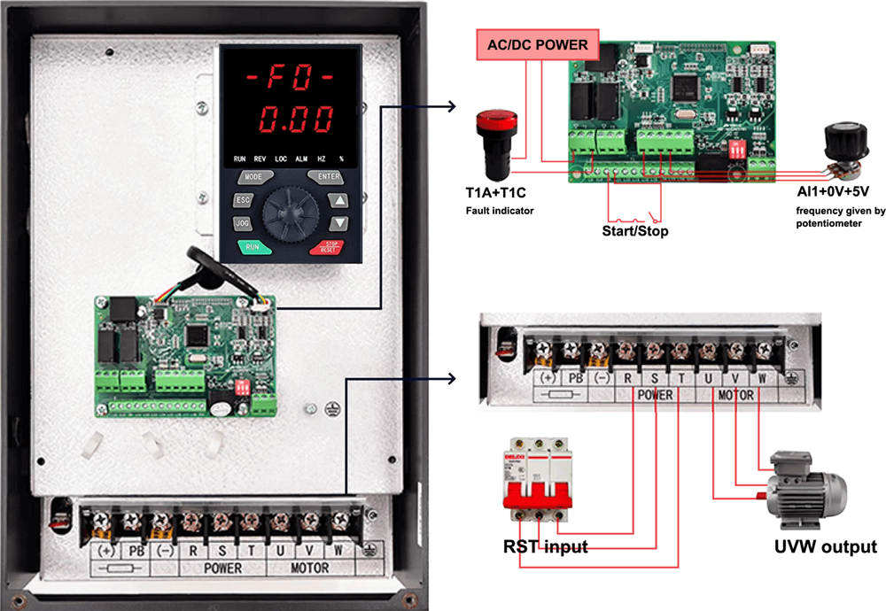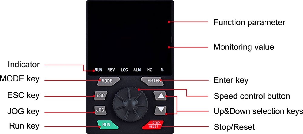 | Jog-Steuerung | Der Motor kann sofort gestartet und gestoppt werden; Einstellbereich der Tippfrequenz: 0,0–20,0 Hz; Jog-Stop-Modus: Verzögerung/Frei/Gleichstrombremsung |